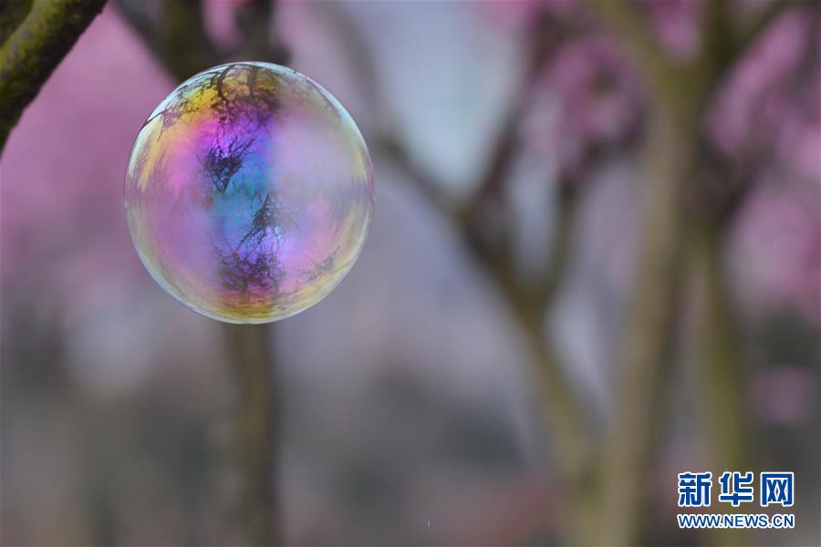 3月1日,在贵州省余庆县,小朋友吹出的泡泡映出公园里一派春色。 新华社发(贺春雨 )