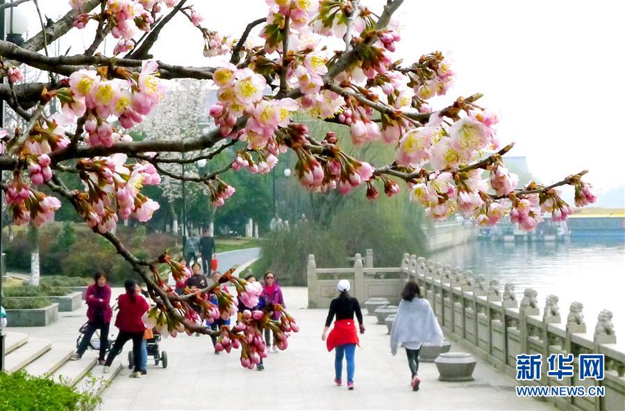 3月3日,几名市民在早樱花掩映的苏州环城河健身步道游玩。眼下,位于江苏省苏州市环城河边的早春樱花美丽绽放,夺人眼球。 新华社发(王建中 摄)