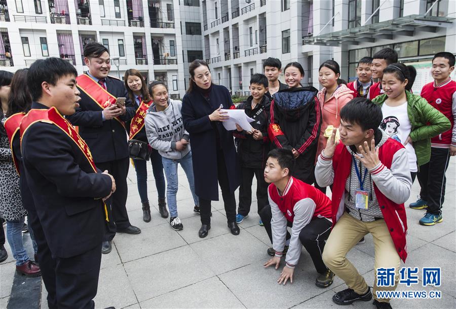 当日,全国道德模范刘洋和“刘洋爱心社”成员以及武汉铁路局团委的志愿者来到武汉市第一聋哑中学,为孩子赠送爱心物资,与他们进行趣味游戏互动。志愿者们将持续开展精准帮扶联谊活动, 把更多爱传递给聋哑学生们。 新华社记者肖艺九摄