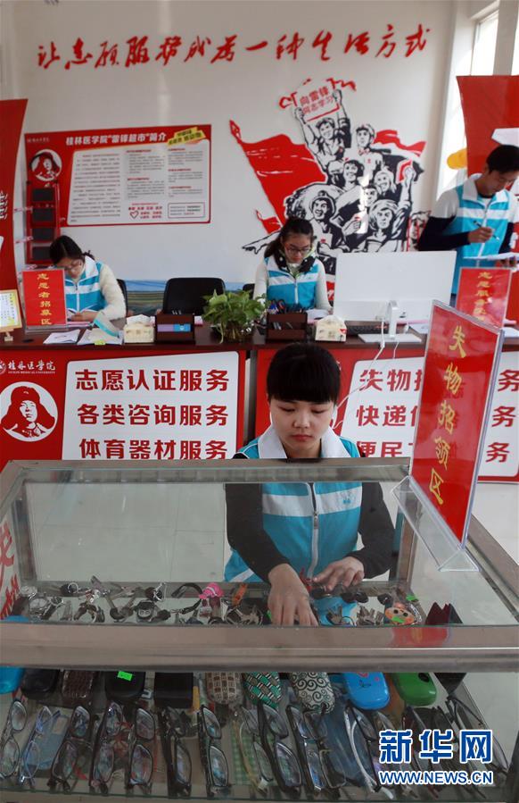 3月4日,在桂林医学院的“雷锋超市”中,一名大学生志愿者在整理“失物”。在广西桂林市桂林医学院临桂校区中,建有一个约30平方米的“雷锋超市”,于2014年11月正式营业。“雷锋超市”有便民生活、快递认领和失物招领等六大服务项目,由学生志愿者服务。一年多来,该“雷锋超市”共提供免费服务上万次,成为传递爱心的公共平台。新华社发(李忠波 摄)