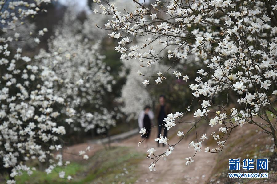 3月4日,游客在长岭村一片盛开的玉兰花丛中漫步。近日,浙江省奉化市锦屏街道长岭村北山近千棵玉兰花树大面积开花,将山野变成花海。 新华社记者黄宗治摄