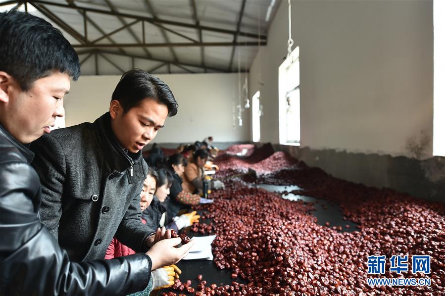 3月4日,天津创客千里驰援山西帮老乡卖枣,“农梦成真”团队成员在抽查红枣的质量。新华社发 曹阳 摄