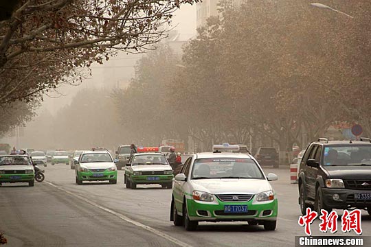 莎车县主干道车辆在沙尘暴天气里缓慢行进。王小军 摄