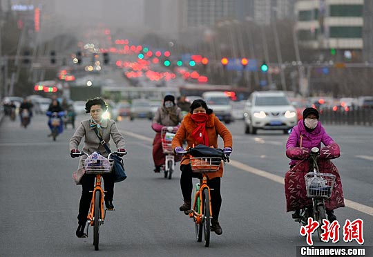 3月4日,山西太原遭遇大风降温天气,民众外出迎着风沙艰难骑行。中新社记者 韦亮 摄