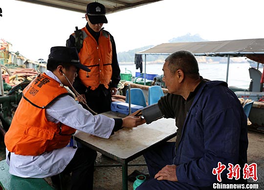 海警军医为出海渔民进行义务巡诊。蔡荣锟 摄