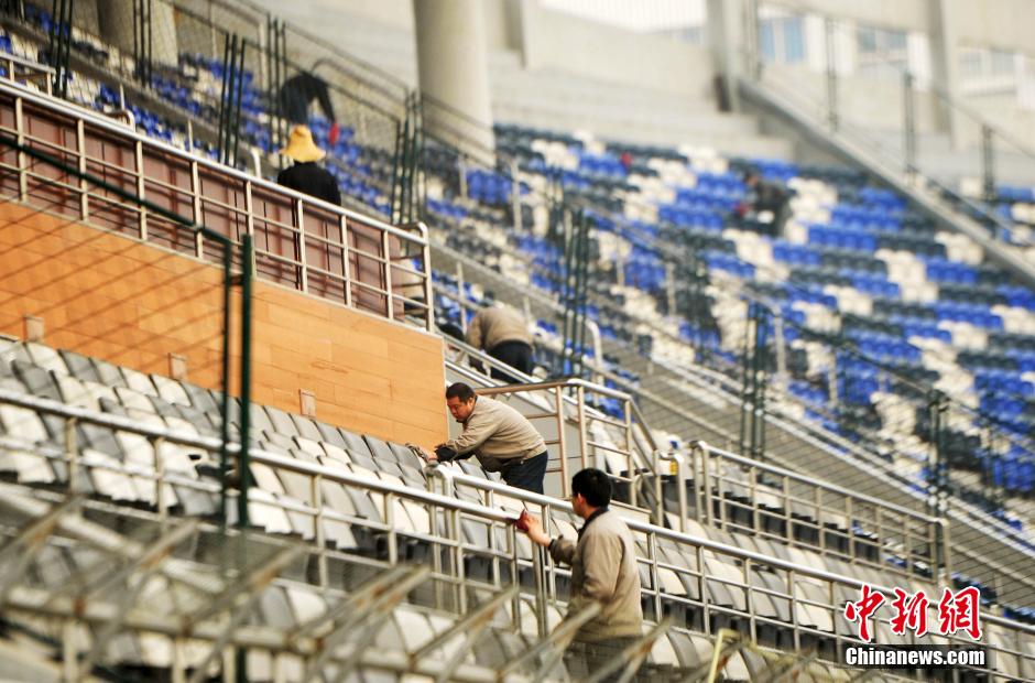 3月4日,石家庄裕彤国际体育中心,工作人员正在紧张备战。2016赛季中国足球超级联赛即将开赛,该赛事由中国足球协会组织,是中国大陆地区最高级别的职业足球联赛。中新社记者 翟羽佳 摄