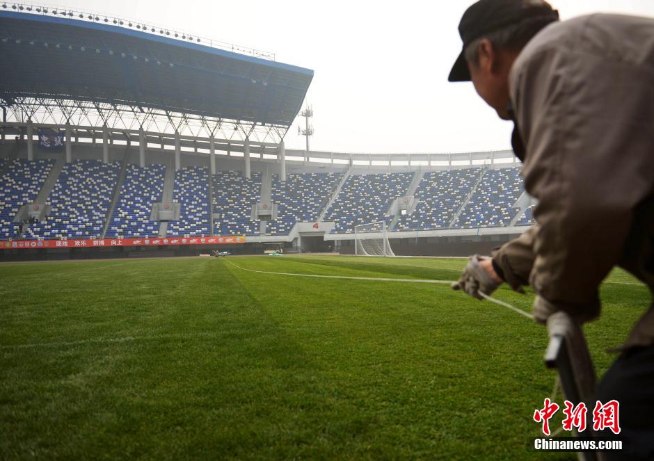 3月4日,石家庄裕彤国际体育中心,工作人员正在紧张备战。2016赛季中国足球超级联赛即将开赛,该赛事由中国足球协会组织,是中国大陆地区最高级别的职业足球联赛。中新社记者 翟羽佳 摄