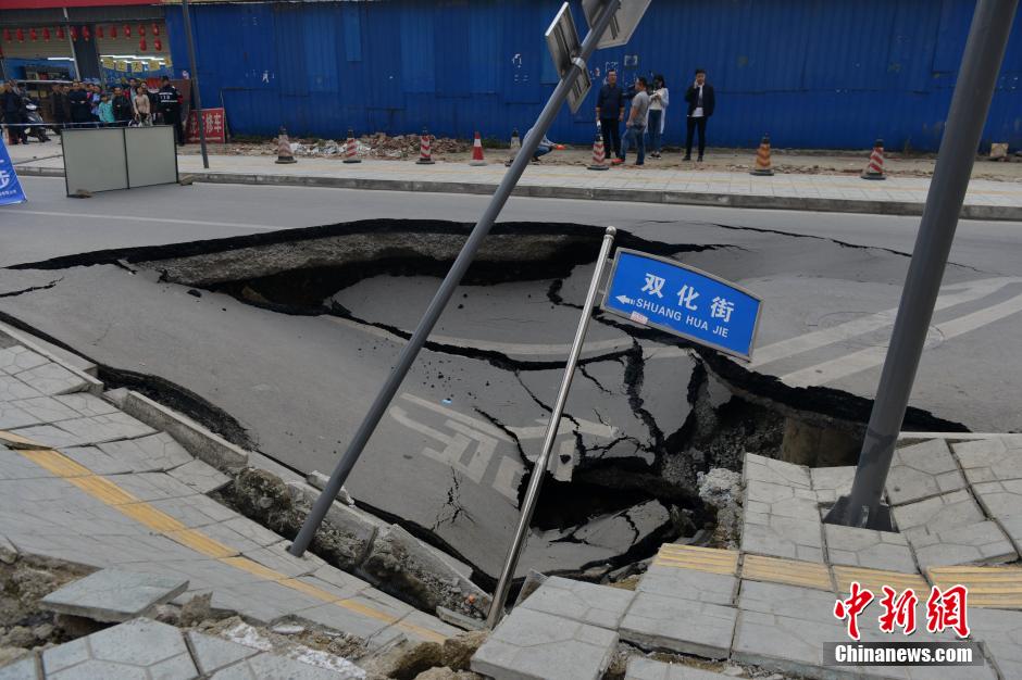 3月6日下午,成都市双化街发生路面塌陷事故。事发时,一辆出租车陷入坑中,尚无人员受伤情况。 张浪 摄