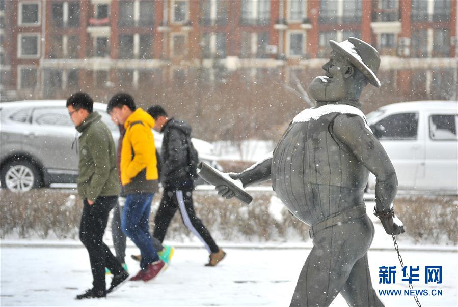 3月7日,春雪飘落在长春市内一处雕塑上。当日,吉林省多地迎来降雪天气,吉林省气象台9时发布寒潮蓝色预警,预计局地降温幅度可达6-8摄氏度。 新华社记者许畅摄