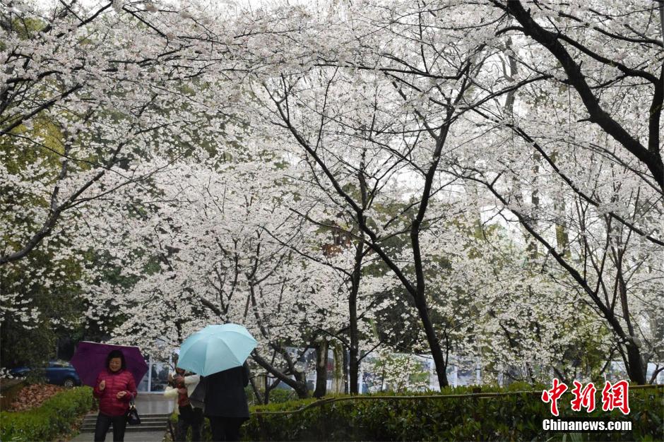 武汉大学樱花初放 游客冒雨赏樱