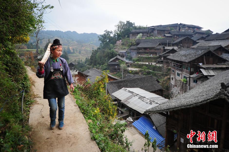 3月8日国际妇女节,在贵州省丹寨县排莫苗寨,苗家妇女日出而作,日落而归,过着平淡的生活。图为35岁的罗闹保练肩扛扁担走出家门,到村口挑水泥用于修缮房屋。 中新社记者 贺俊怡 摄
