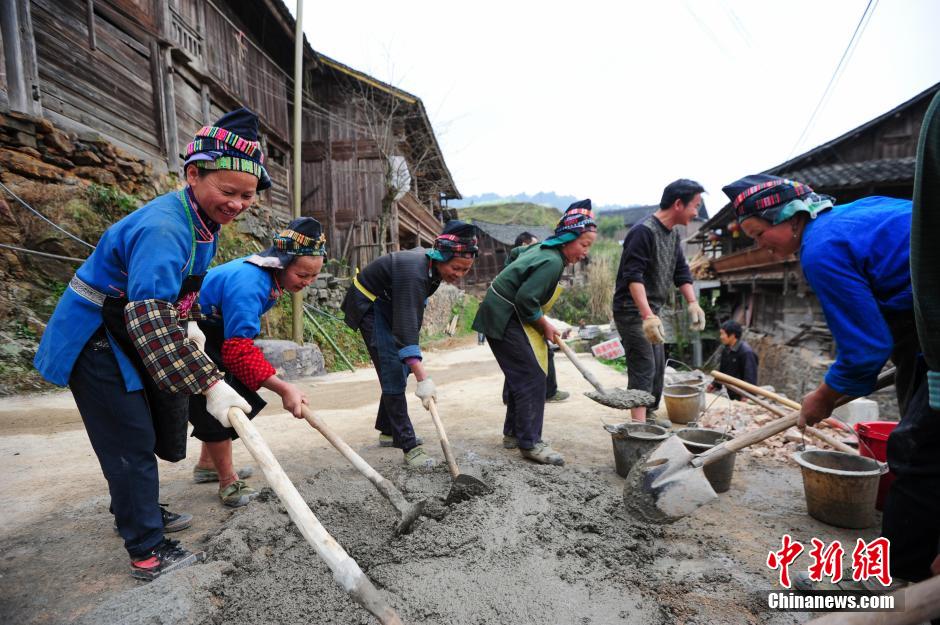 3月8日国际妇女节,在贵州省丹寨县排莫苗寨,苗家妇女日出而作,日落而归,过着平淡的生活。图为苗家妇女们在搅拌水泥,准备与男人们一起新修一条通往寨尾的水泥路。 中新社记者 贺俊怡 摄
