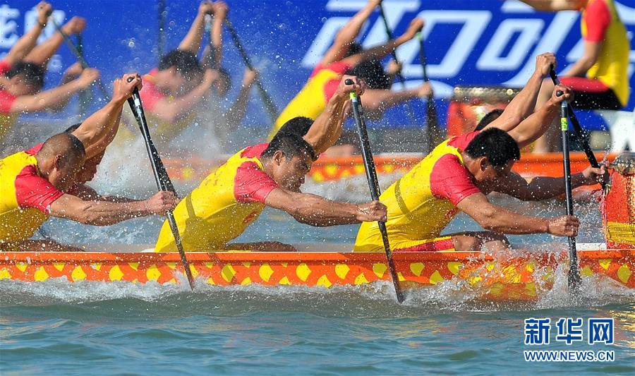 图为2012年2月23日农历二月二,参赛队伍在海南万宁举行的中华龙舟大赛中劈波斩浪,奋力划行。 新华社发
