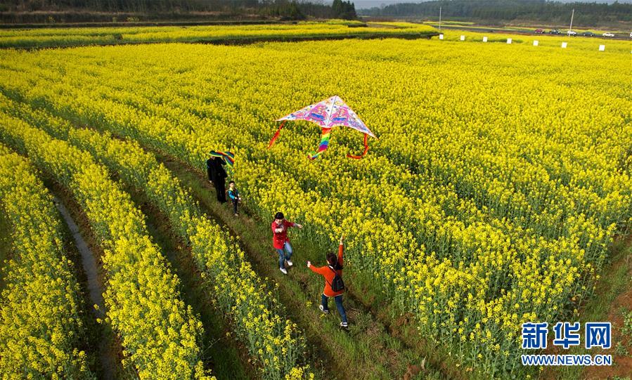 图为2015年3月21日农历二月初二,人们在湖北省咸宁市咸安区贺胜桥镇油菜花海中放风筝。 新华社发
