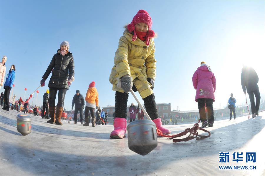 图为2012年2月23日农历二月二,在伊春市首届冰雪龙舟赛上,孩子们在进行抽冰尜比赛。 新华社发