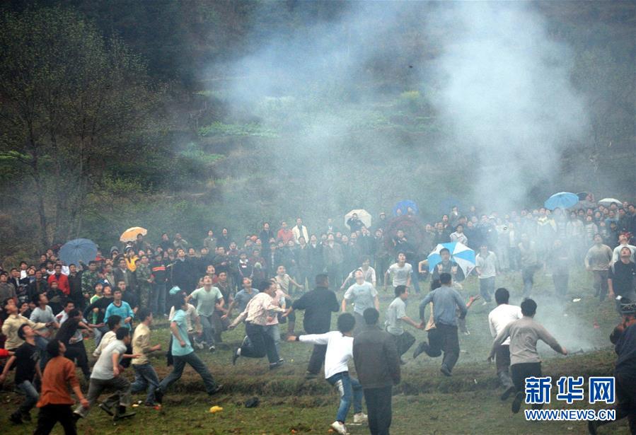 图为2008年3月9日农历二月二,在广西融水县洞头乡,当地群众争先恐后参加抢花炮比赛。“抢花炮”是广西少数民族一项传统的体育活动。 新华社发