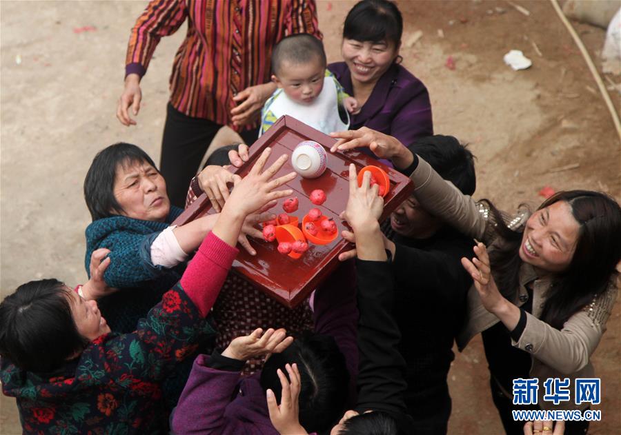 图为2012年2月22日,在福建省莆田市城厢区泗华村溪安祖社广场,村民们参加“抢豆腐丸”民俗活动。每年农历“二月二”的前一天,福建省莆田市城厢区泗华村的村民们都要集中到一起用豆腐和菜制作豆腐丸子。豆腐丸子经过晾晒后,被装在一个个塑料碗里,由村里的青年男子用托盘端着,供村民争抢。村民们将抢到的豆腐丸子带回家,在“二月二”这天煮了一家人一起吃,共同祈盼新一年团圆平安、事业红火。新华社发