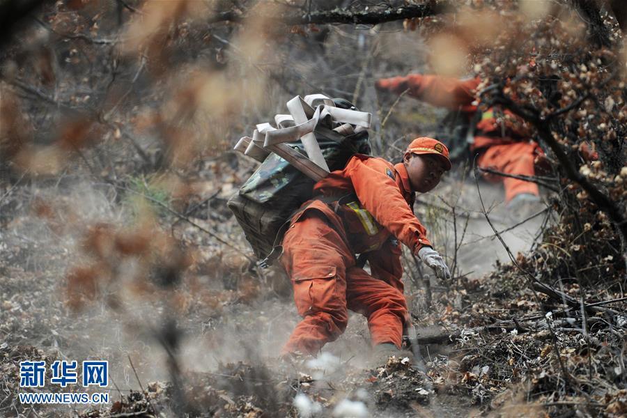 3月9日,武警甘肃省森林总队陇南支队一名战士在清理火场。新华社记者 陈斌 摄 图片来源:新华网