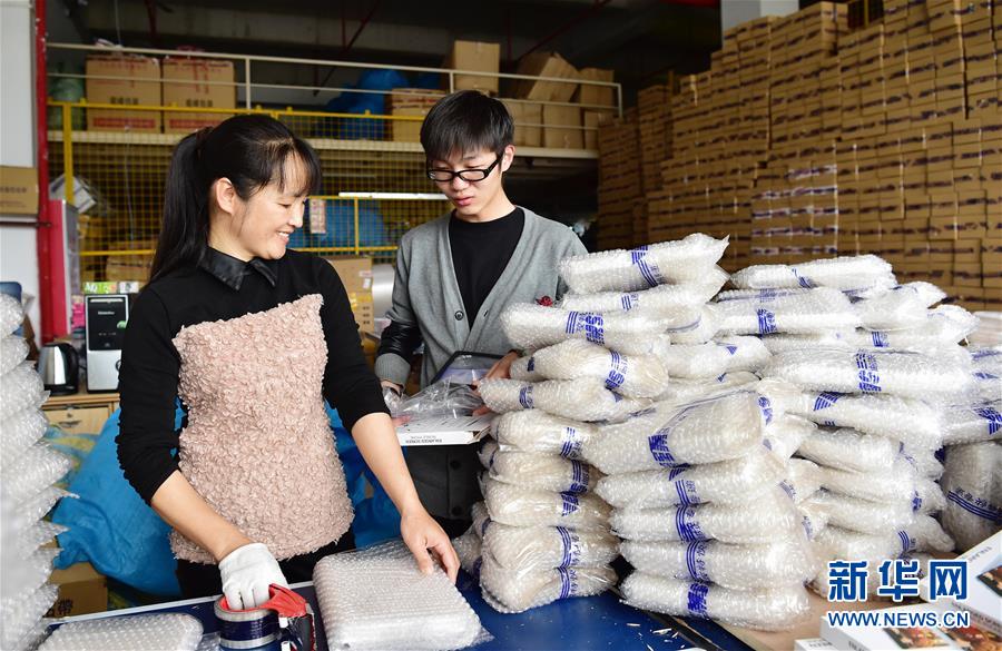 来自浙江的大学生嵇浩翔(右)在泉州市大学毕业后,选择留在安溪县电商创业,现在他平均一个月订单量达到五万多单,产品销往全国各地(3月9日摄)。近年来,福建省安溪县从资金、监管、财税、人才等诸多方面对电商发展给予政策支持,全县涌现一批电商村,许多安溪农民成为当地农村电商的主力军。目前安溪县电商从业人员达7万多人,电商企业3000多家。2014年,安溪全县电商交易额超33亿元,其中茶叶电商交易额超20亿元。新华社记者 魏培全 摄