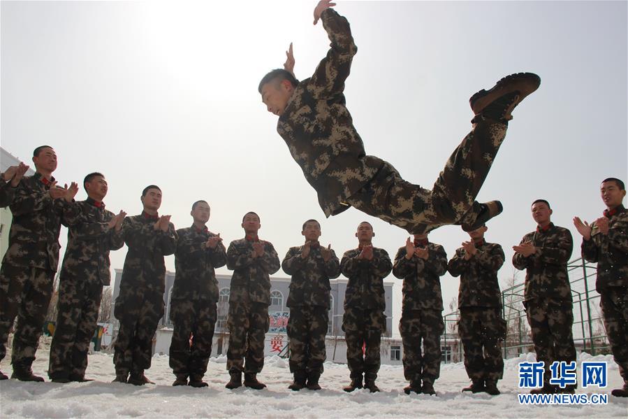 3月10日,官兵正在开展倒功训练。当日,武警新疆阿勒泰哈巴河县公安边防大队机动中队进行冬季大练兵,官兵们通过开展雪地班组战术、武装巡逻搜索、地形研判、四百米障碍、三人攀登、防袭击演练等训练科目,以实战的角度提升部队在艰苦恶劣环境下的反恐作战技能,确保遇有突发情况能够快速处置,全面提升部队战斗力。新华社发(石晓坤 摄)