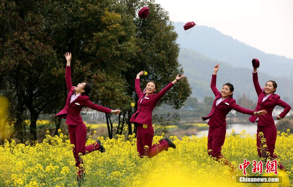 几位“高姐”在油菜花地里跳跃。 鲍赣生 摄