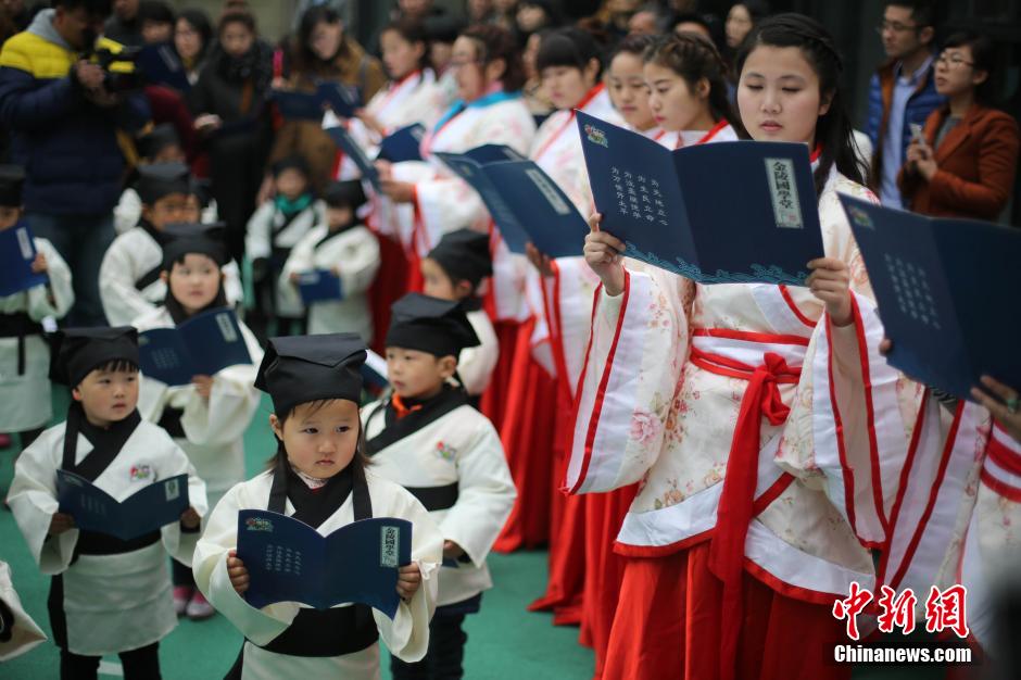 3月13日,南京市浅草幼儿园105名刚入学的小萌娃们在金陵国学堂的老师带领下,着汉服行古礼,拜圣人诵孝经,写人字学感恩举行了一场别开生面的人生“开笔礼”。同时在现场还向南京及周边城市3-12岁的少年儿童发出一起来参加今年的“国韵宝贝六一晚会”的邀请,共同体味传统文化的韵味。 中新社记者 泱波 摄