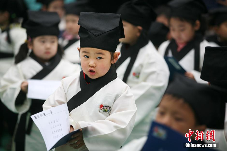 3月13日,南京市浅草幼儿园105名刚入学的小萌娃们在金陵国学堂的老师带领下,着汉服行古礼,拜圣人诵孝经,写人字学感恩举行了一场别开生面的人生“开笔礼”。同时在现场还向南京及周边城市3-12岁的少年儿童发出一起来参加今年的“国韵宝贝六一晚会”的邀请,共同体味传统文化的韵味。图为孩子们跟着老师诵孝经。
