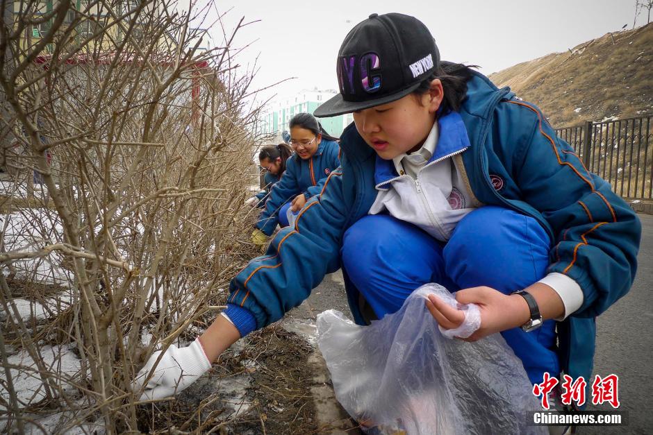3月13日,新疆乌鲁木齐市第十中学的50余名中学生,前往该市珠江路和平渠旁的某小区,捡拾树林带与路边遗留的垃圾。随着春季到来,积雪渐渐消融,掩埋在积雪里的垃圾纷纷显露出来,13日乌鲁木齐市双合社区组织辖区内的居民,学生开展以“小手拉大手,我是城市美容师”为主题的环保文明主题活动,社区工作人员、社区居民与中学生们一起用双手美化自己的家园。刘新 摄