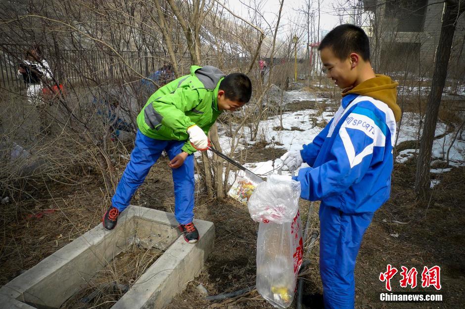 中学生正在清理小区内卫生死角的垃圾。 刘新 摄