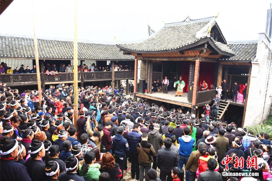 3月13日农历二月初五,以“夜郎”文化著称的“三王宫”庙会在广西三江侗族自治县良口乡和里村举行。当天,上千名侗、苗族民众参与的传统祭祀、芦笙踩堂、演侗戏等少数民族特色活动,吸引上万中外游客参加。和里三王宫为祭祀夜郎王第三王子的侗族文化历史古迹,原为明代建筑,清朝乾隆年间当地居民募捐扩建宫堂,2013年被列为全国重点文物保护单位。图为观看侗戏的民众。 龚普康 摄