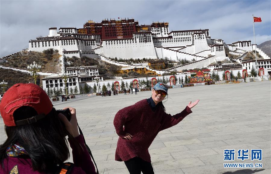 3月14日,游客在布达拉宫前拍照留影。近日,随着气温转暖,拉萨街头的游客也多起来,即将迎来旅游的黄金季节。 新华社记者 觉果 摄