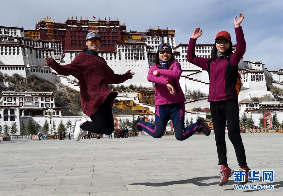 3月14日,游客在布达拉宫前拍照留影。近日,随着气温转暖,拉萨街头的游客也多起来,即将迎来旅游的黄金季节。 新华社记者 觉果 摄