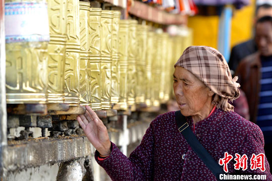 3月14日,正在八廓街内转经的藏族老阿妈。李林 摄