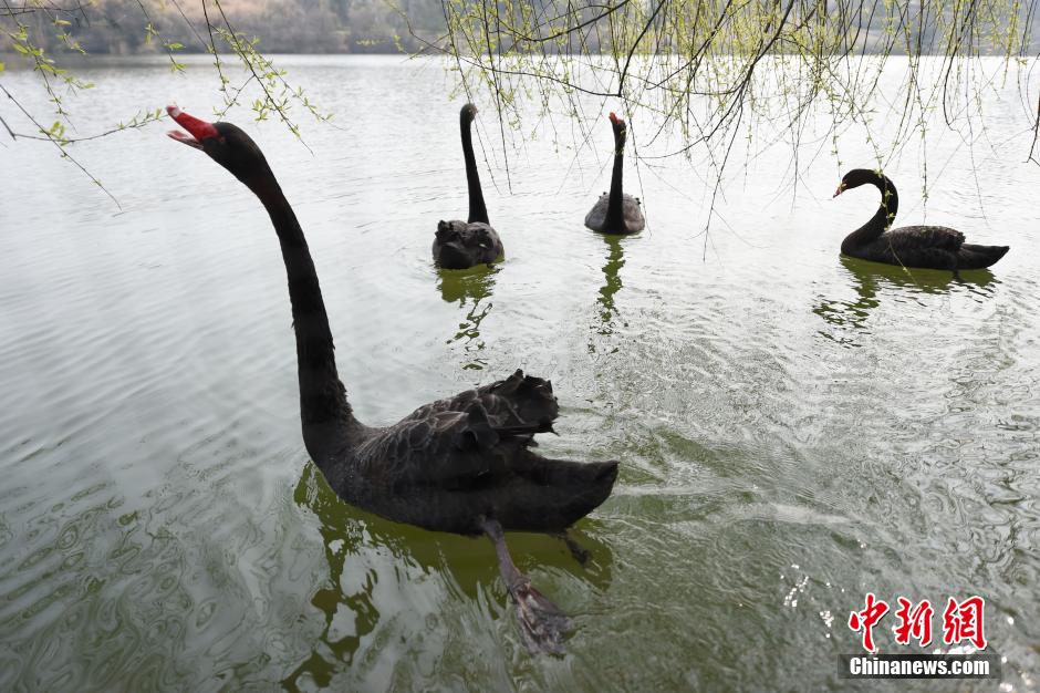 3月14日,南京师范大学仙林校区采月湖内,随着当地气温的不断攀升,四只黑天鹅在水中欢快地游弋,尽情地享受春暖花开的气息。中新社记者 泱波 摄