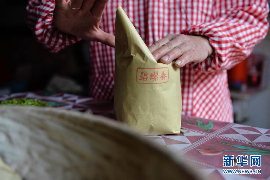 3月14日,在太湖湖畔的东山镇,茶农张阿娣在包装碧螺春茶。时下,太湖湖畔苏州东山岛的碧螺春茶陆续上市,1.1万亩碧螺春茶迎来采摘期。茶农钱洪方、张阿娣夫妇家种植有4亩茶园,这些天每天早上6点不到,他们便赶到山上茶园采摘鲜嫩的叶芽,忙碌4个小时后下山回到家中,挑拣采好的叶芽、炒制并包装成袋,最后销往经销商。据介绍,苏州吴中区的东山、金庭两镇是洞庭山碧螺春的原产地,2015年东山镇碧螺春销售额达到7000多万元,当地农业部门预计之前的寒潮低温天气对2016年的茶叶产量并无太大影响。新华社记者 季春鹏 摄