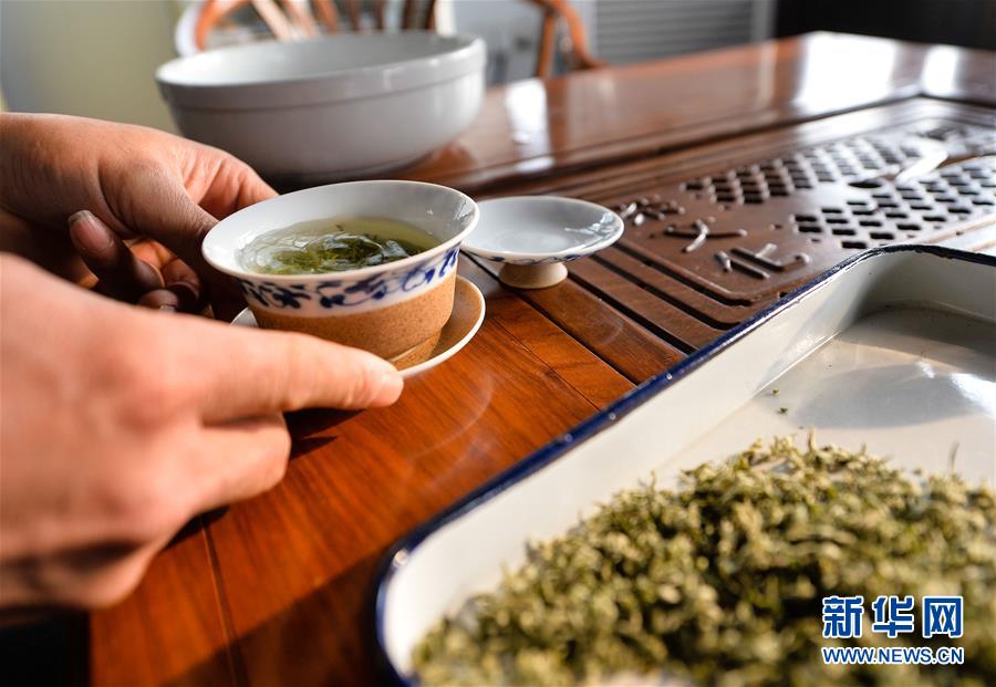 3月14日,在苏州东山镇,严介龙在冲泡碧螺春。新华社记者 季春鹏 摄