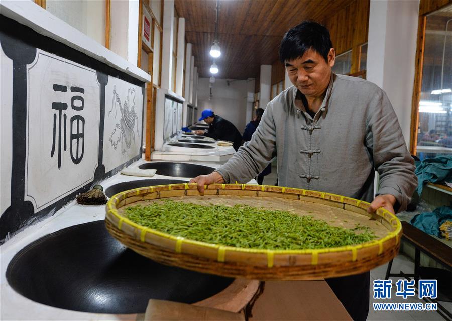 3月14日,在苏州东山镇,严介龙对青叶进行抖青回香。新华社记者 季春鹏 摄