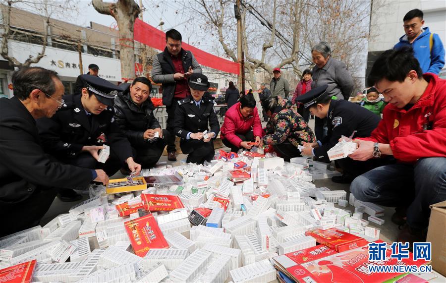 3月15日,山东省枣庄市公安局市中分局经侦大队民警在宣传活动中进行无害化销毁假冒伪劣药品,吸引市民共同参与。当日是“3·15”国际消费者权益日,各地纷纷开展宣传咨询活动,为群众提供法律咨询、消费维权、商品真伪鉴别等服务,提高广大消费者防骗识假维权能力。新华社发(孙中喆 摄)