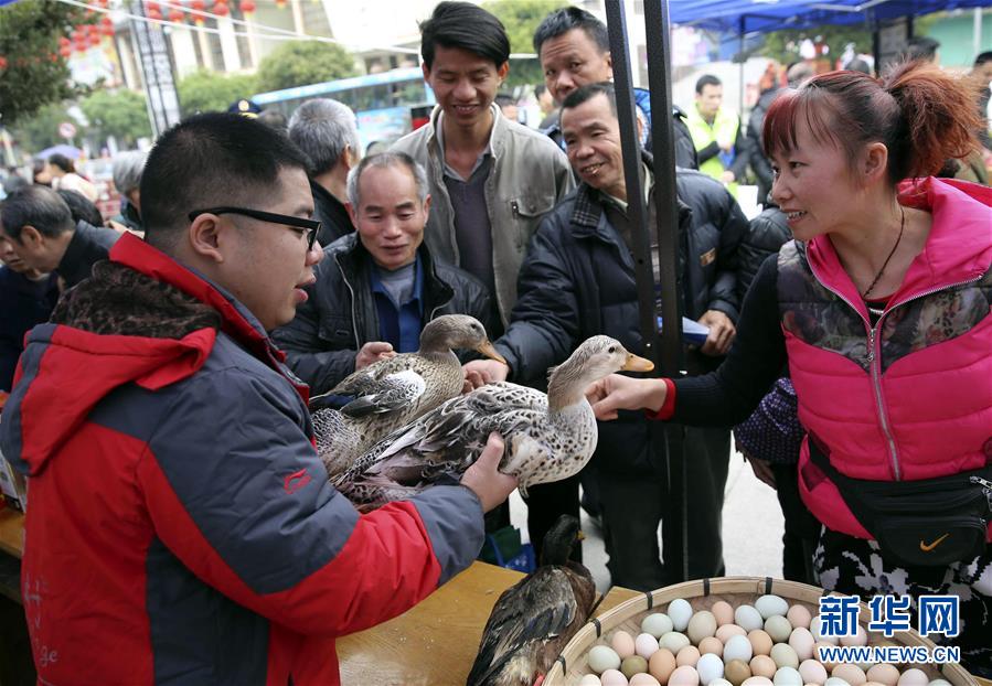3月15日,在广西柳州市融水苗族自治县芦笙文化广场,私企业主蒙可畅(左)向消费者讲解如何辨别真假“融水香鸭”。当日是“3·15”国际消费者权益日,各地纷纷开展宣传咨询活动,为群众提供法律咨询、消费维权、商品真伪鉴别等服务,提高广大消费者防骗识假维权能力。新华社发(龙涛 摄)