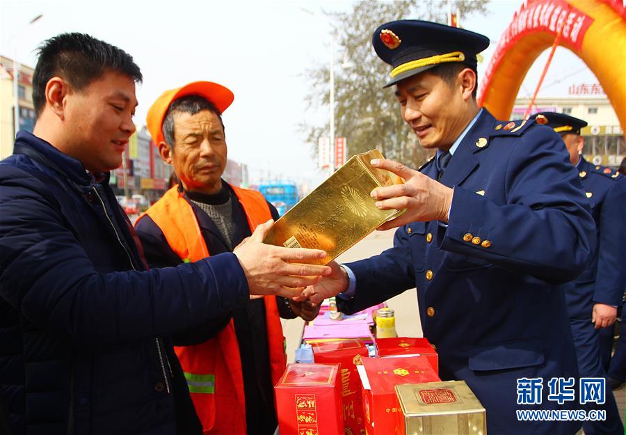 3月15日,工商执法人员在山东省枣庄市山亭区街头向消费者介绍真假白酒的辨别方法。当日是“3·15”国际消费者权益日,各地纷纷开展宣传咨询活动,为群众提供法律咨询、消费维权、商品鉴别等服务,提高广大消费者防骗识假维权能力。新华社发(张强 摄)