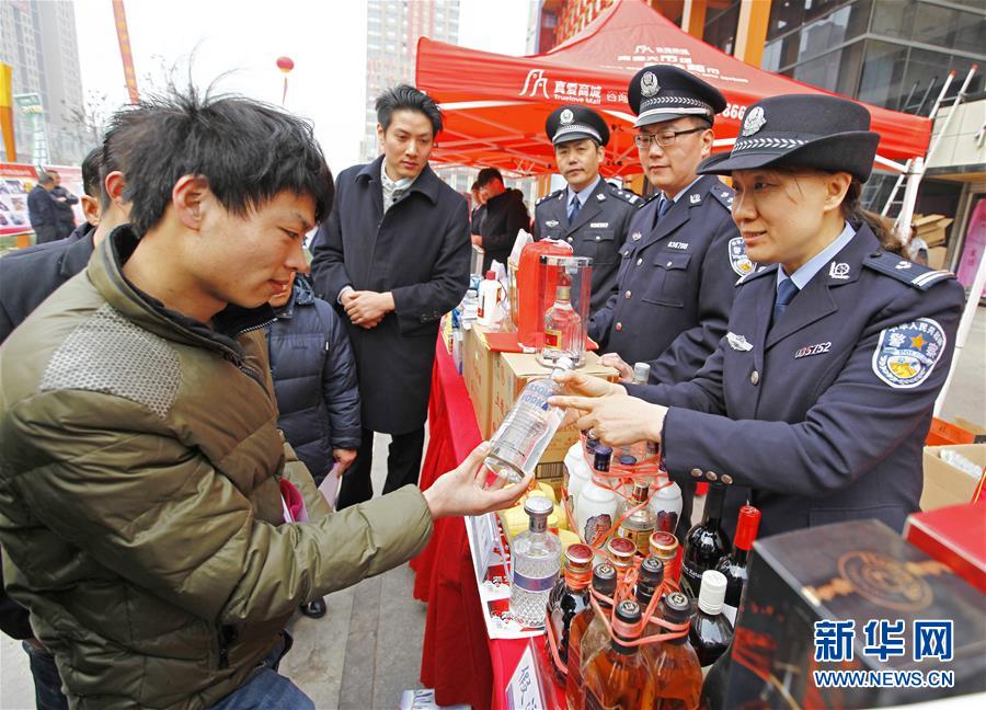 3月15日,山东省滕州市公安局经侦大队民警向消费者讲解如何识别假酒。当日是“3·15”国际消费者权益日,各地纷纷开展宣传咨询活动,为群众提供法律咨询、消费维权、商品真伪鉴别等服务,提高广大消费者防骗识假维权能力。新华社发(宋海存 摄)