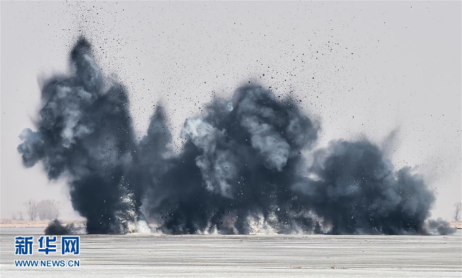3月15日,安装在黄河冰面上的炸药成功爆破。当日,内蒙古水利厅为确保黄河内蒙古段全线平稳开河,在鄂尔多斯市达拉特旗境内进行了两次防凌爆破作业。利用空投炸弹爆破与冰面爆破去除该段黄河浮冰,排除凌汛险情。新华社记者 连振 摄