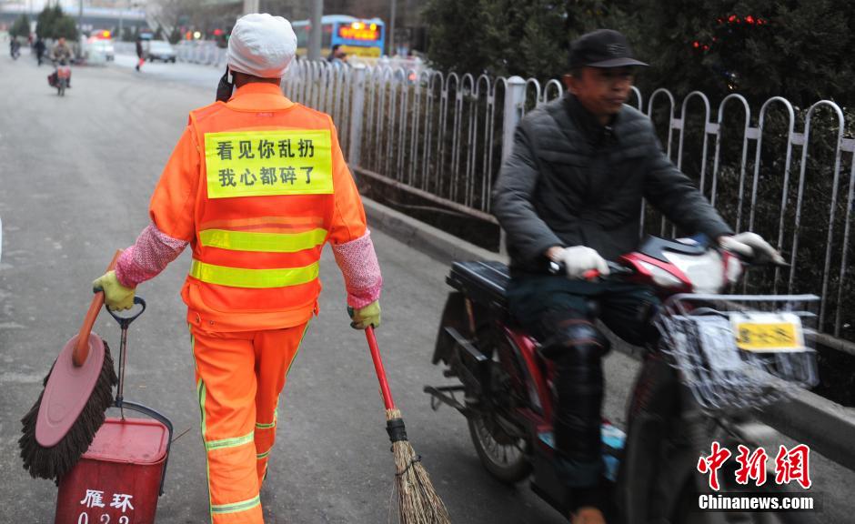 3月21日,兰州街头环卫工身穿印有“看见你乱扔,我心都碎了”等萌萌哒标语的反光马甲清扫垃圾。据兰州市城关区雁滩环卫市政管理所介绍,为了保护环卫工的人身安全,环卫所特意为500多位保洁员定制了新的反光马甲。考虑到老式的文明宣传标语市民很难接受,雁滩环卫所集思广益,在马甲后定制了个性、易懂的文明宣传标语。杨艳敏 摄