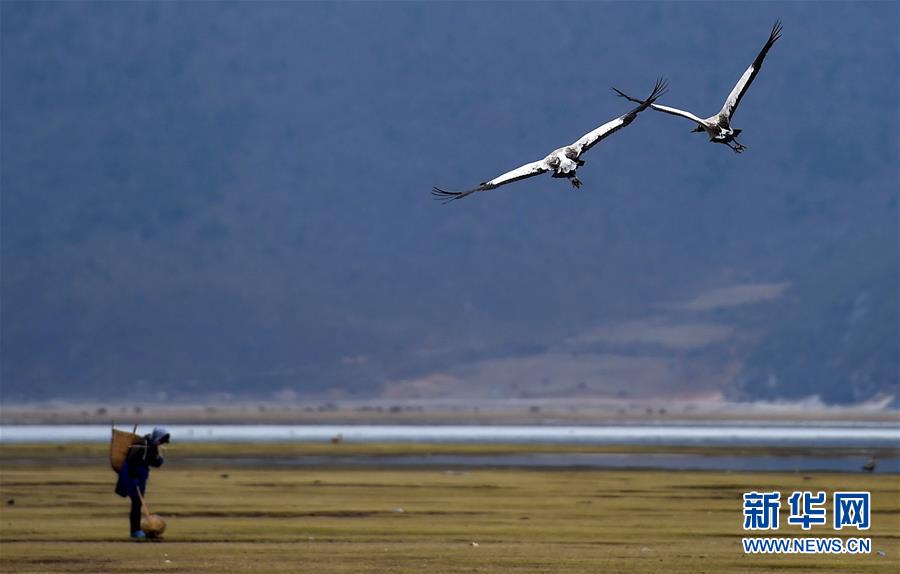 3月21日,一些黑颈鹤在云南香格里拉纳帕海自然保护区自由飞翔,距离在地里劳作的当地群众仅20米左右。近年来,随着高原湿地的恢复与保护,在海拔3300米左右的云南省迪庆藏族自治州香格里拉市纳帕海自然保护区,每年前来越冬的黑颈鹤的数量从几年前的200多只增加到目前的400只左右。黑颈鹤是国家一级保护动物,属高原特有鹤类,主要分布在西藏、贵州、青海、四川、云南等地。目前每年来到纳帕海越冬的各类候鸟已达12万只左右。新华社记者 蔺以光 摄