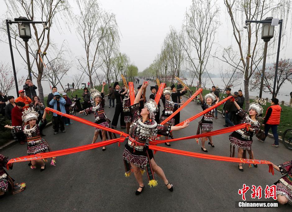 3月21日上午,多名姑娘和小伙身着少数民族盛装,在杭州西湖边载歌载舞。苗族姑娘高唱着敬酒歌,端着牛角酒杯向路过的游人们敬酒;苗族小伙吹起轻盈而高亢的芦笙,姑娘们按芦笙曲调节奏变换出优美姿势,头上的锦鸡银饰跃跃欲飞,银角冠一点一摇,腿边花带一飘一闪,裙脚边的“羽毛”翻飞。热情歌舞映衬灵秀西湖,吸引前往西湖的游客驻足观看。林云龙 摄