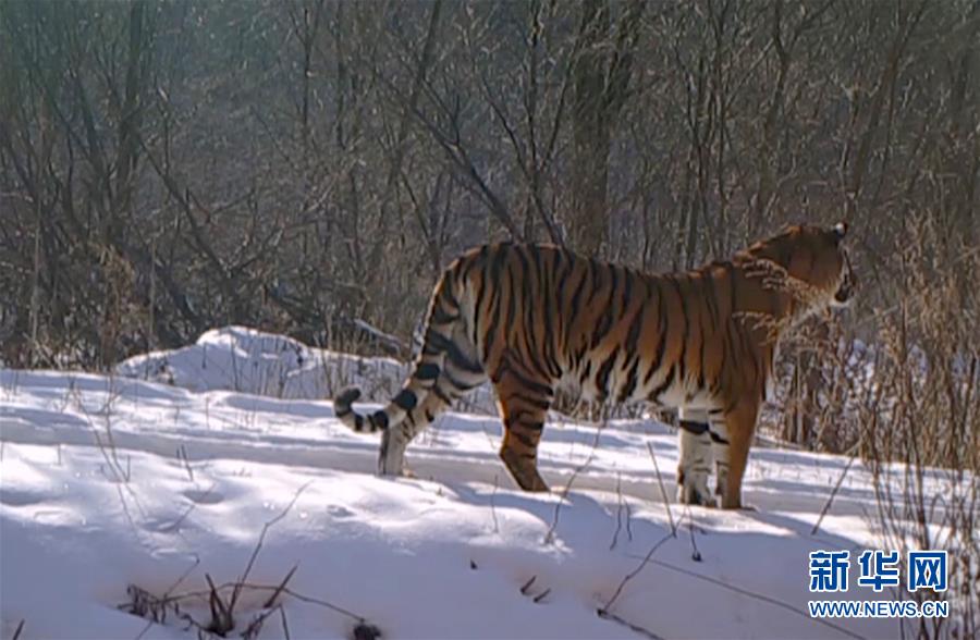 记者从珲春东北虎国家级自然保护区了解到,该保护区近日开展了针对远红外相机的首次野外作业。通过远红外线监测视频和专家现场勘察的诸多虎豹迹象显示,从去年秋天至今,已有一对野生东北虎和一对野生东北豹在该保护区内组建了“幸福家庭”。这是保护区内远红外相机于2015年12月30日拍摄到的一只野生东北虎。 新华社发