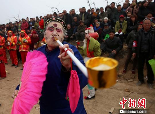 山西新绛迎来千年古庙会 农民田间表演“二鬼摔跤”