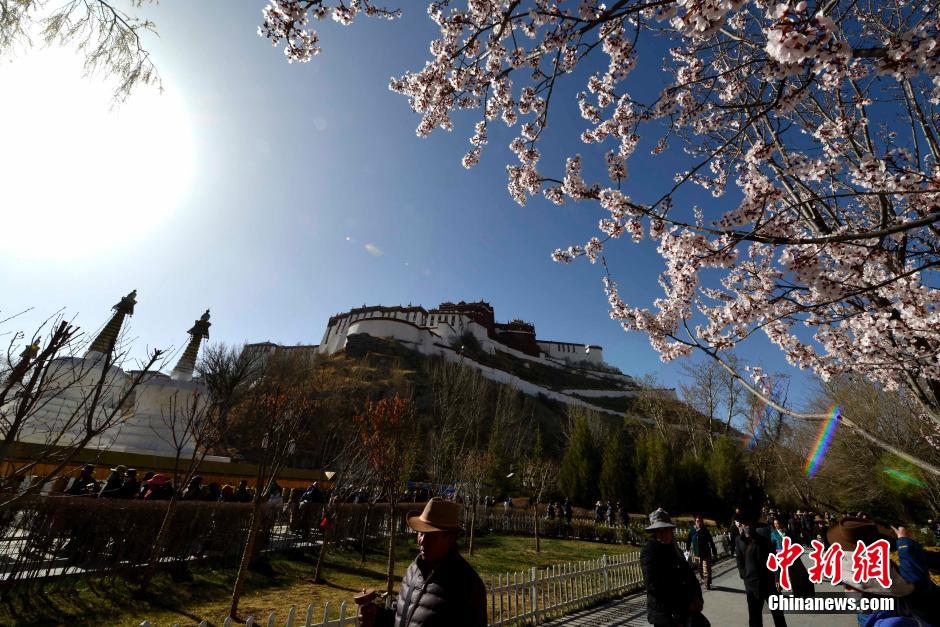 3月24日,市民在布达拉宫脚下的宗角禄康公园内转经。随着气温逐渐升高,三月的拉萨花开柳绿,春色满园。李林 摄