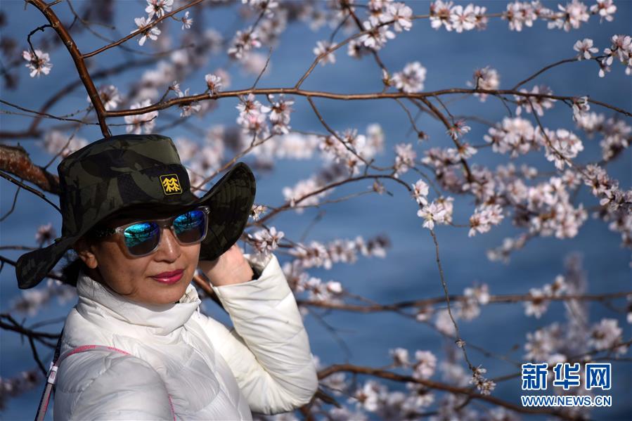 3月24日,一名女士在颐和园西堤的山桃花旁留影。