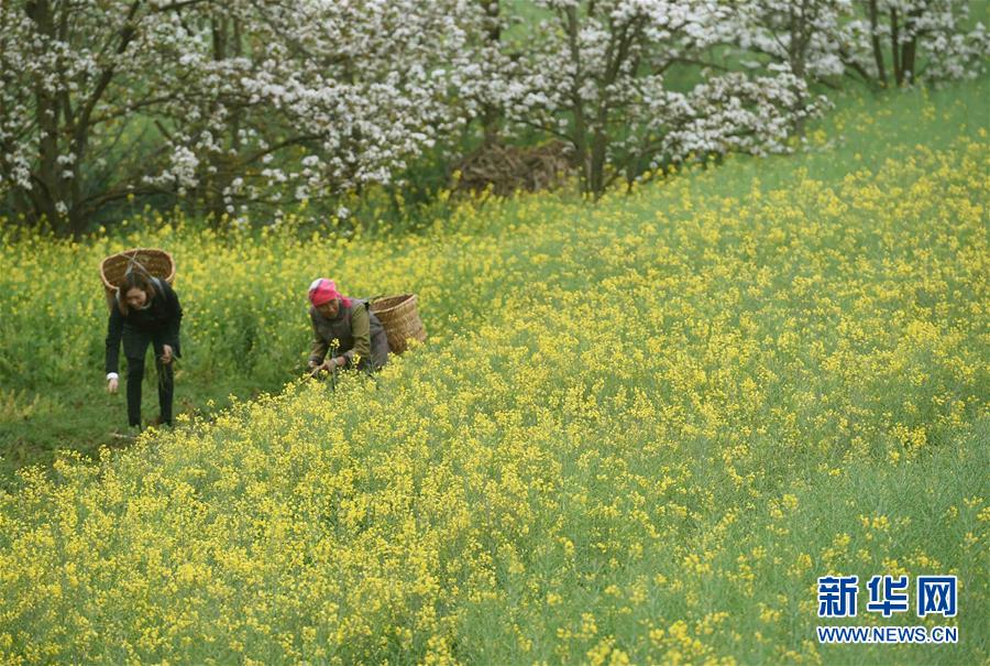 3月24日,游客在罗平县马街镇跟当地村民在油菜地里体验拔草。